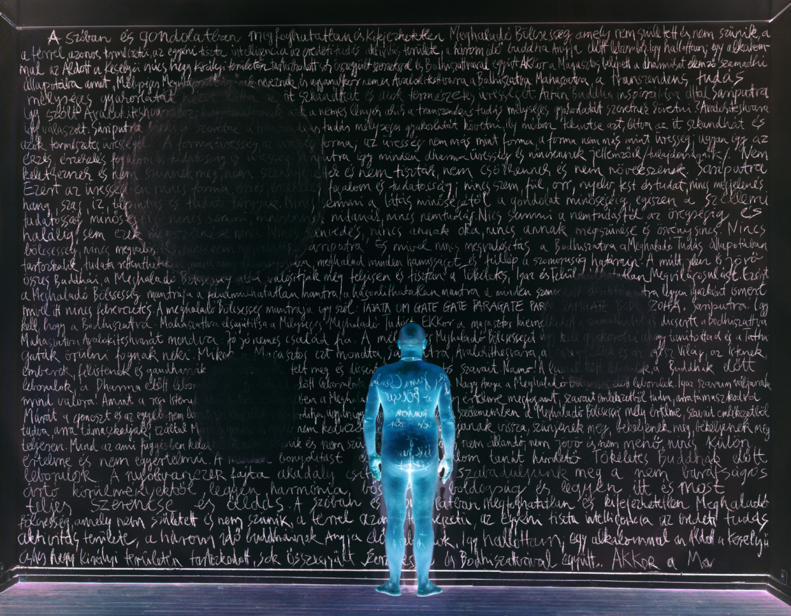 The display of each piece of art is individualistic. The description of each piece of art is written on what appears to be a large blackboard. A nude man stands in the bottom central area of the photograph. The text does not hide behind him, but instead continues to overlap his body.