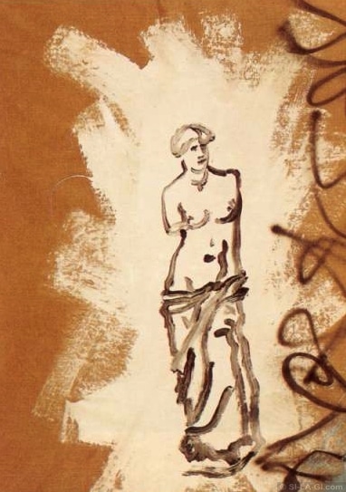 When we see on the picture “Trigon” the motif of the Venus of Milo embodying the Hellenistic beauty ideal, next to it the motif of Michelangelo’s David and to the right the hardly perceptible motif of a sitting Buddha, we perceive the embarrassment of cultural “over-saturation” and of the accumulation of motifs, and at the same time the immense tension between the automatic brush-work of gesture painting and the conventionalism of the individual forms, which have become symbols. This tension results at the same time from the individual fate of the artist, from his experiences and intentions, in the last resort from his own existence, because it was he who wilfully composed the image by arranging the different motifs.